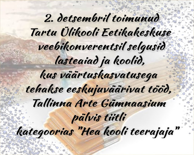 Kolmapäeval, 2. detsembril avati Tallinna Arte Gümnaasiumi õpilaste kunstitööde näitus „distantsilt…’’ Kaja Kultuurikeskuses - avati seekord distantsilt. Kevad algas distantsõppega ruumilises mõttes – õpetajad oma kodus ja õpilased oma kodudes. Kunstipraktika ajal vabas õhus hoidsime kõik omavahel distantsi ning tegime värviküllaseid maastikke, mida tuleks vaadata distantsilt, sest siis hakkavad väikesed puhta värvi täpikesed elama ja hingama nagu päris loodus. Ajalise distantsiga tegime nende suviste maastike järgi talvemaastikke, olles innustust saanud esimesest lumest.
